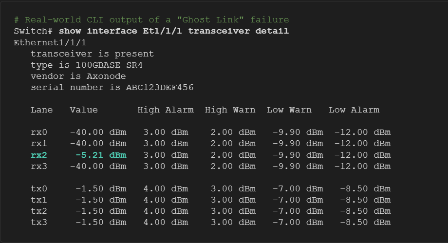 Consider the following real-world case from one of our clients: He purchased premium modules, meticulously cleaned the fiber, and installed everything perfectly. The power meter read a healthy -5dBm, yet the switch port stayed dark. Even worse, a lane-by-lane check revealed light on only one channel (Rx3), while the other three sat at a haunting -40dBm. It’s a nightmare scenario every engineer knows too well. Welcome to the 100G "Ghost Link" scene.